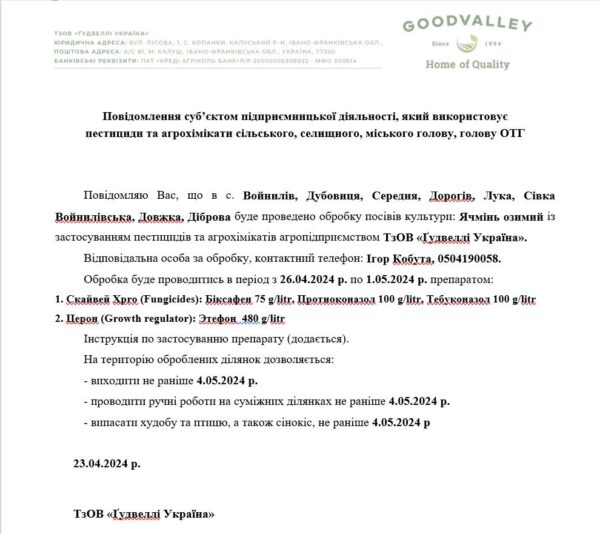 23 Квітня 2024 року У Оголошення 0 Повідомлення про обробку посівів культури із застосуванням пестицидів